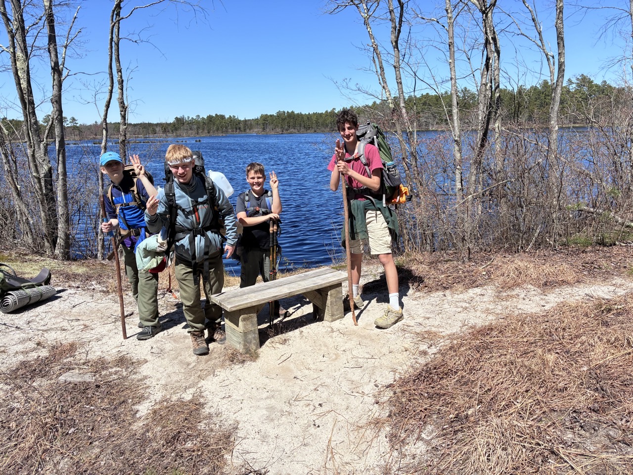 Over Spring Break, four Scouts backpacked 50+ miles (three of them went 60!) through the Pine Barrens on South Jersey’s premiere long distance hiking trail – the Batona Trail. They followed the pink blazes past old iron towns, along roads as older as the USA, through the many burned areas from all of the recent fires (up to 4 years ago and as recent as last week), and past a monument to the Lindbergh of Mexico, Emilio Carranza. They saw fence lizards, heard a pack of coyotes howling, saw a meteor burn, and watched the astronauts land (okay, that part wasn’t along the trail).